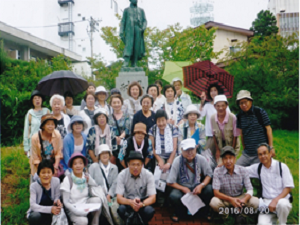 会津若松市北公民館主幹の石田明夫氏の案内で会津若松市七日町界隈を巡りました。前田慶次の子孫の墓・土佐藩の落書き・野口英世ゆかりの教会跡等を見学しました。更に、会津新撰組記念館・阿弥陀寺・御三階・長福寺「おんば様」暑い中の見学でした。昼食は「田事」にてわっぱ飯料理を30人で賑やかにいただきました。