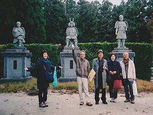 佐藤継信公(左)、源義経公、佐藤忠信公像の前で